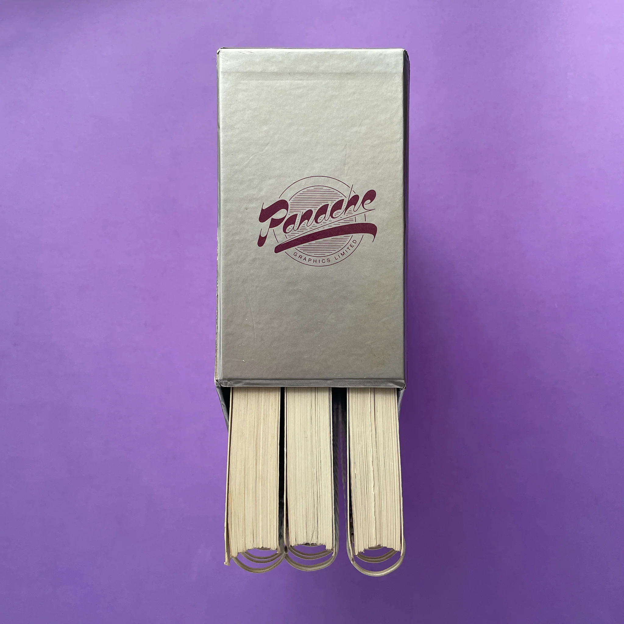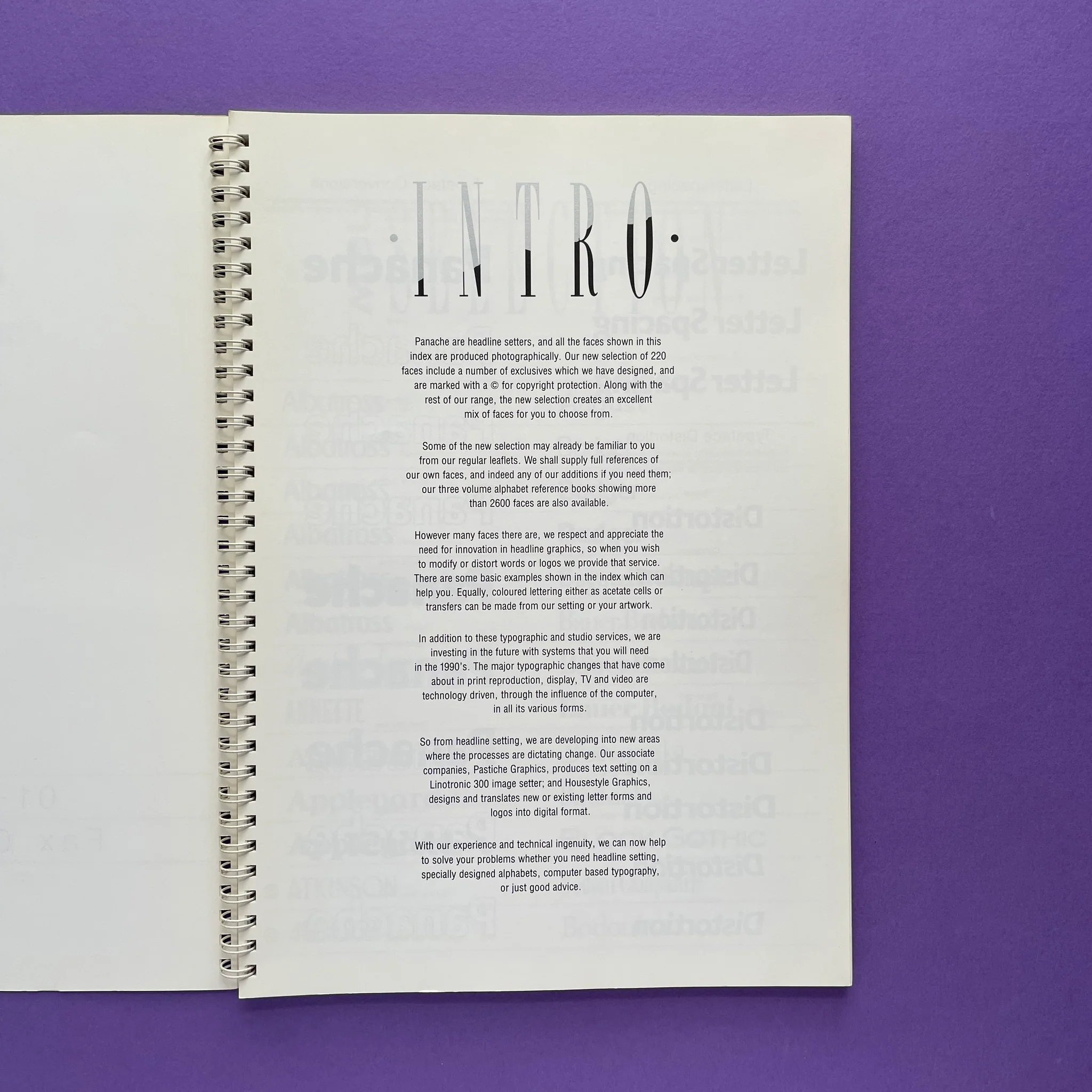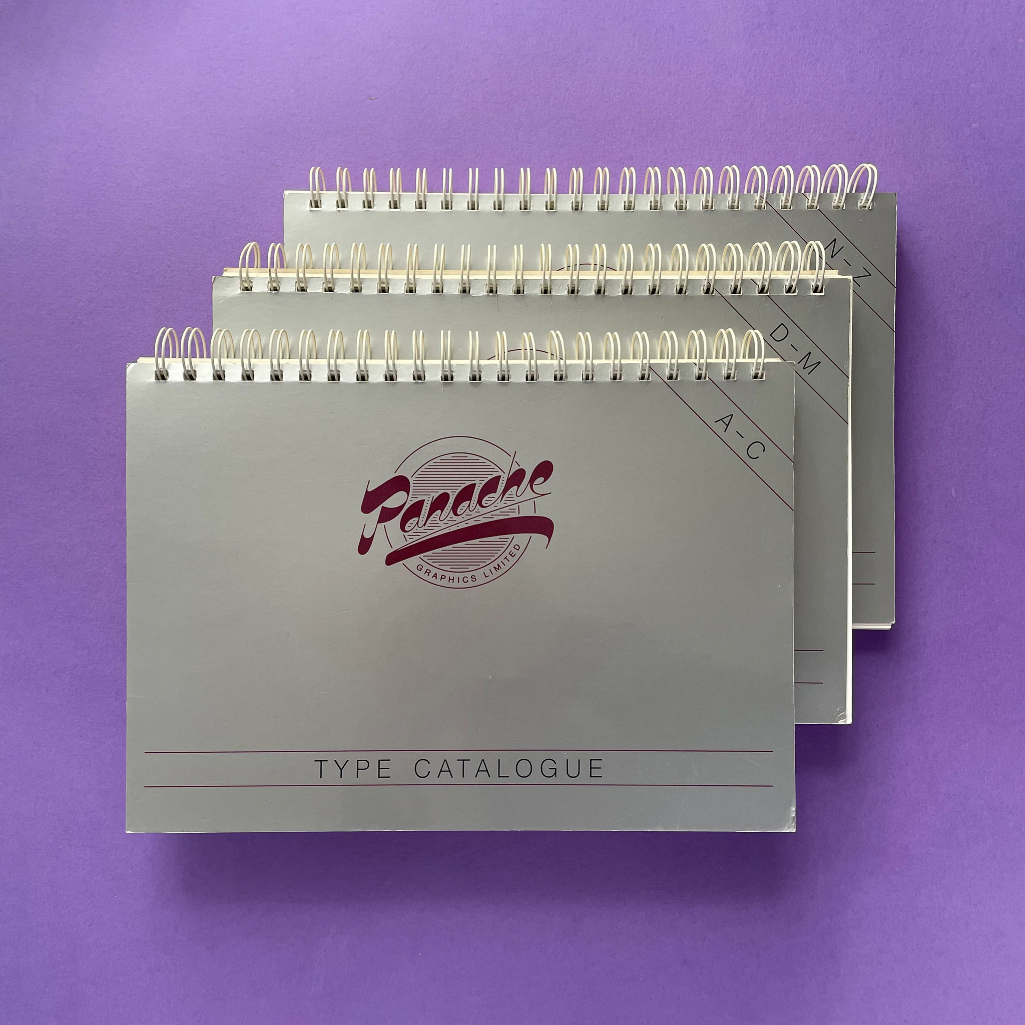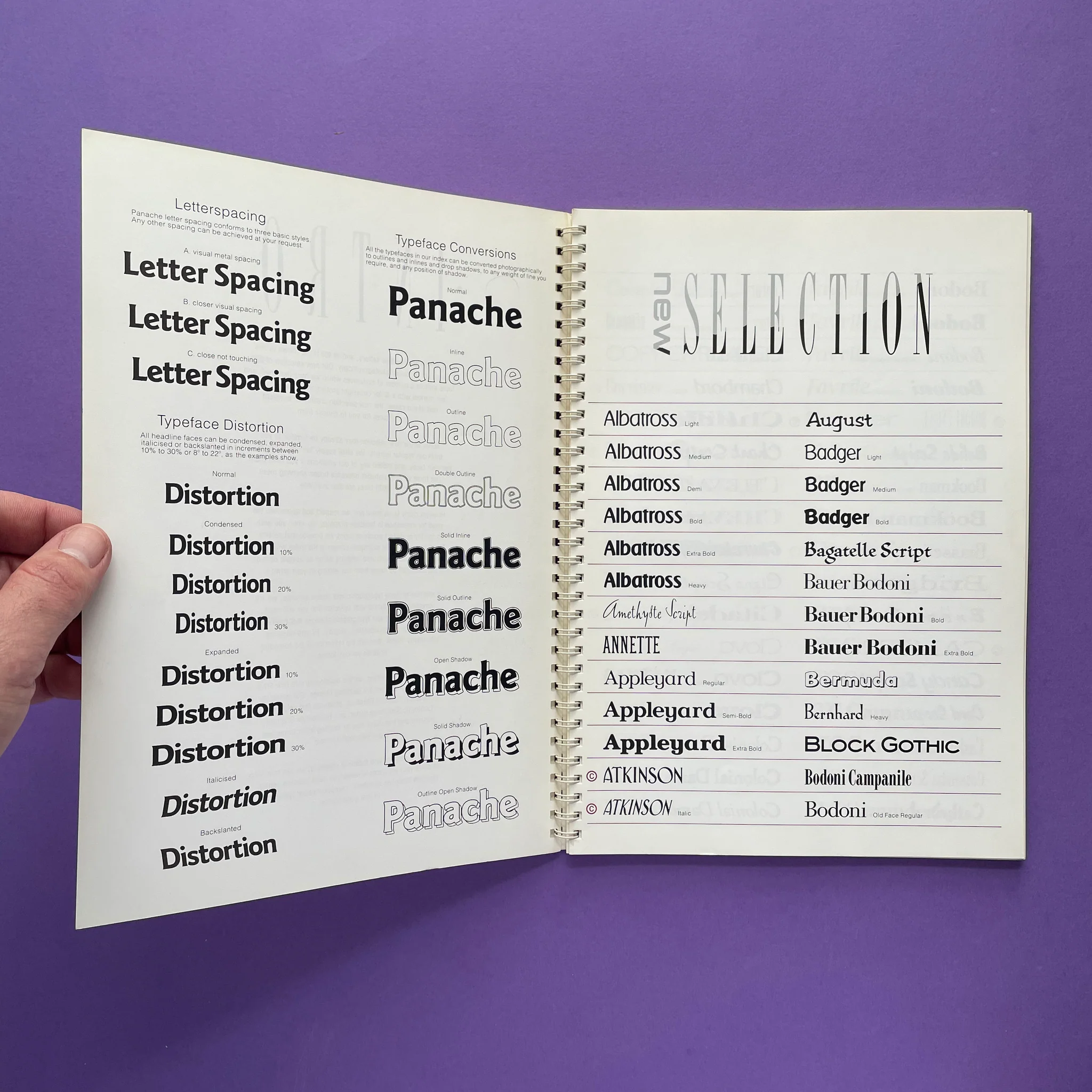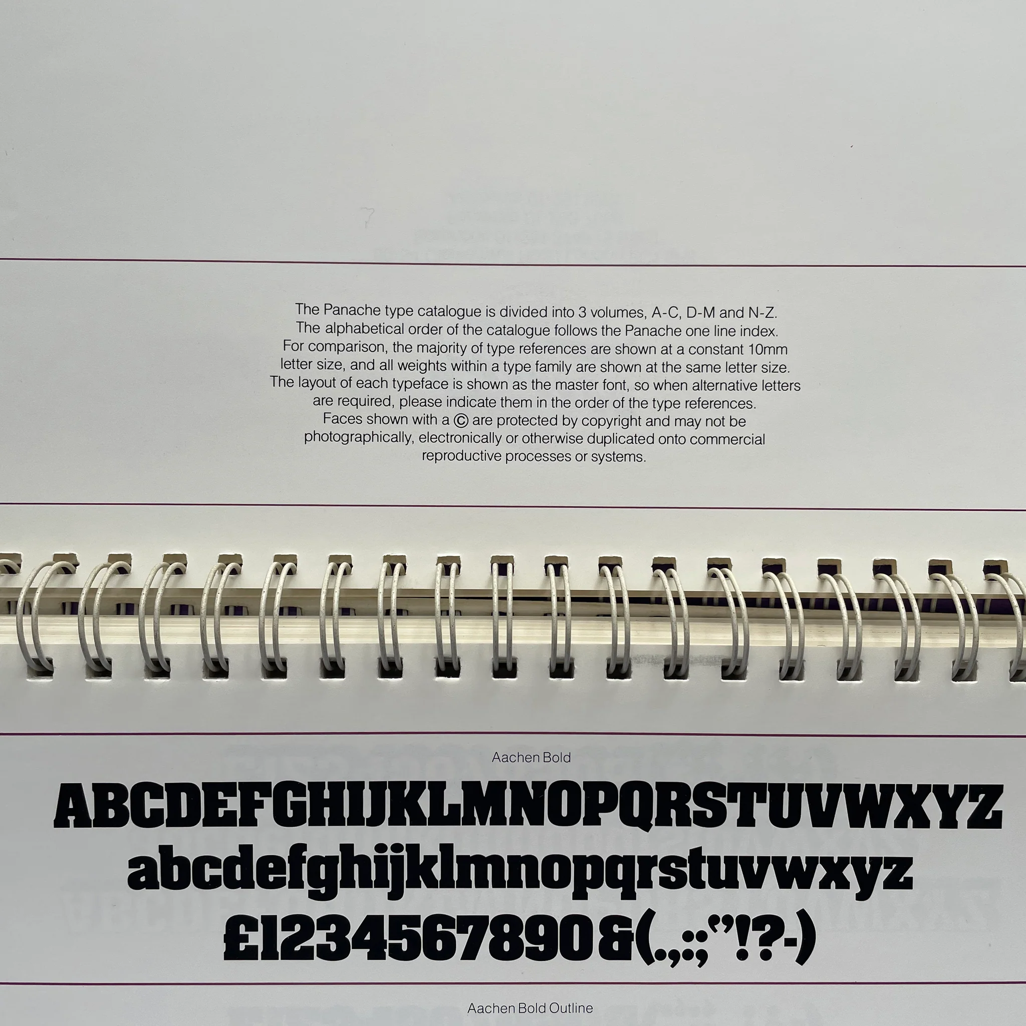 Type Catalogue | Panache | ca. | 1989 | Panache | Photo | UK | London | Glyphs | Bound | 05/27/2025 | $88.77 | FIU (Berlin) | London: Panache Graphics Limited, n.d. Three ring-bound catalogs (A–C, D–M, N–Z) in A4 landscape format with silver covers and glyph sets for more than 2,600 faces. Probably published in the late 1980s. The included typefaces largely match those in the 1990 Headline Index, minus 222 from the “new selection” and a number of skipped styles from larger families. [Photos] | Jul 19, 2025 10:56 PM | |||