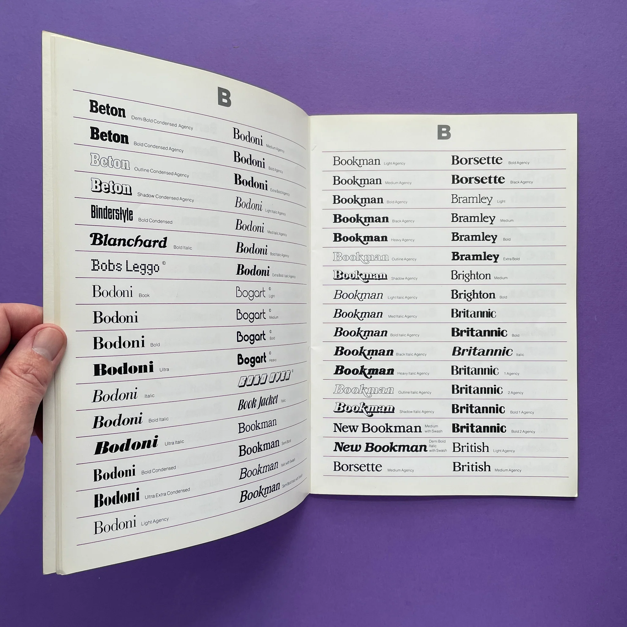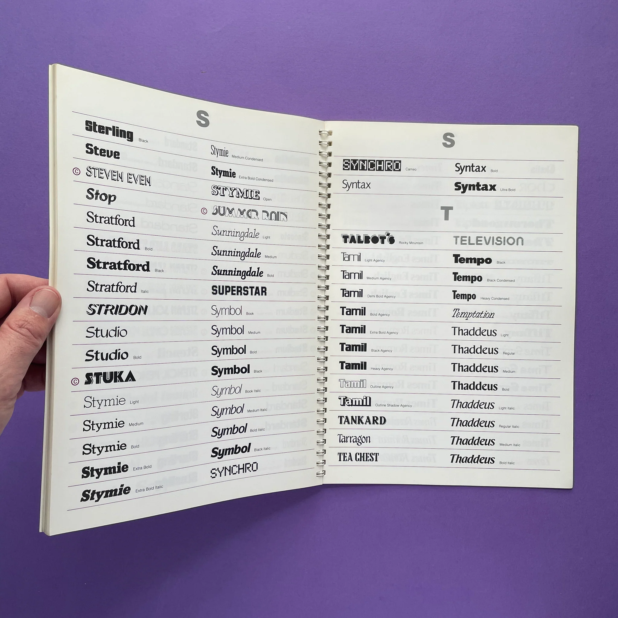 The Typesmiths Catalog of Display Faces, 2 Volumes | The Typesmiths | ITCOtherCompugraphic | Photo | US | Chicago | GlyphsLine | Binder | “AG” in the index refers to Agfa/Compugraphic | Jul 19, 2025 10:56 PM | ||||||||