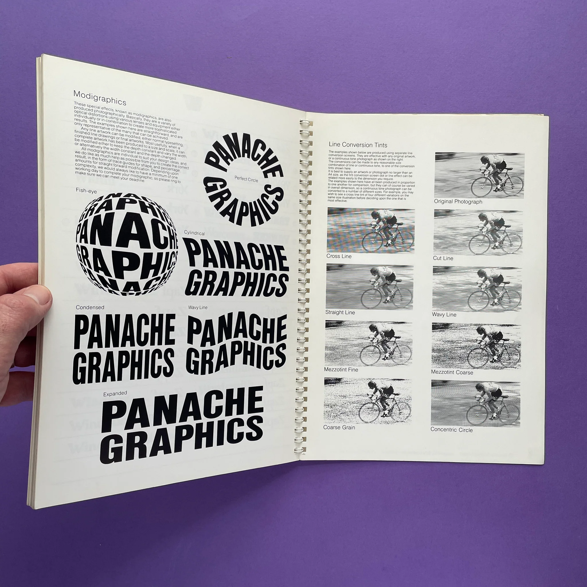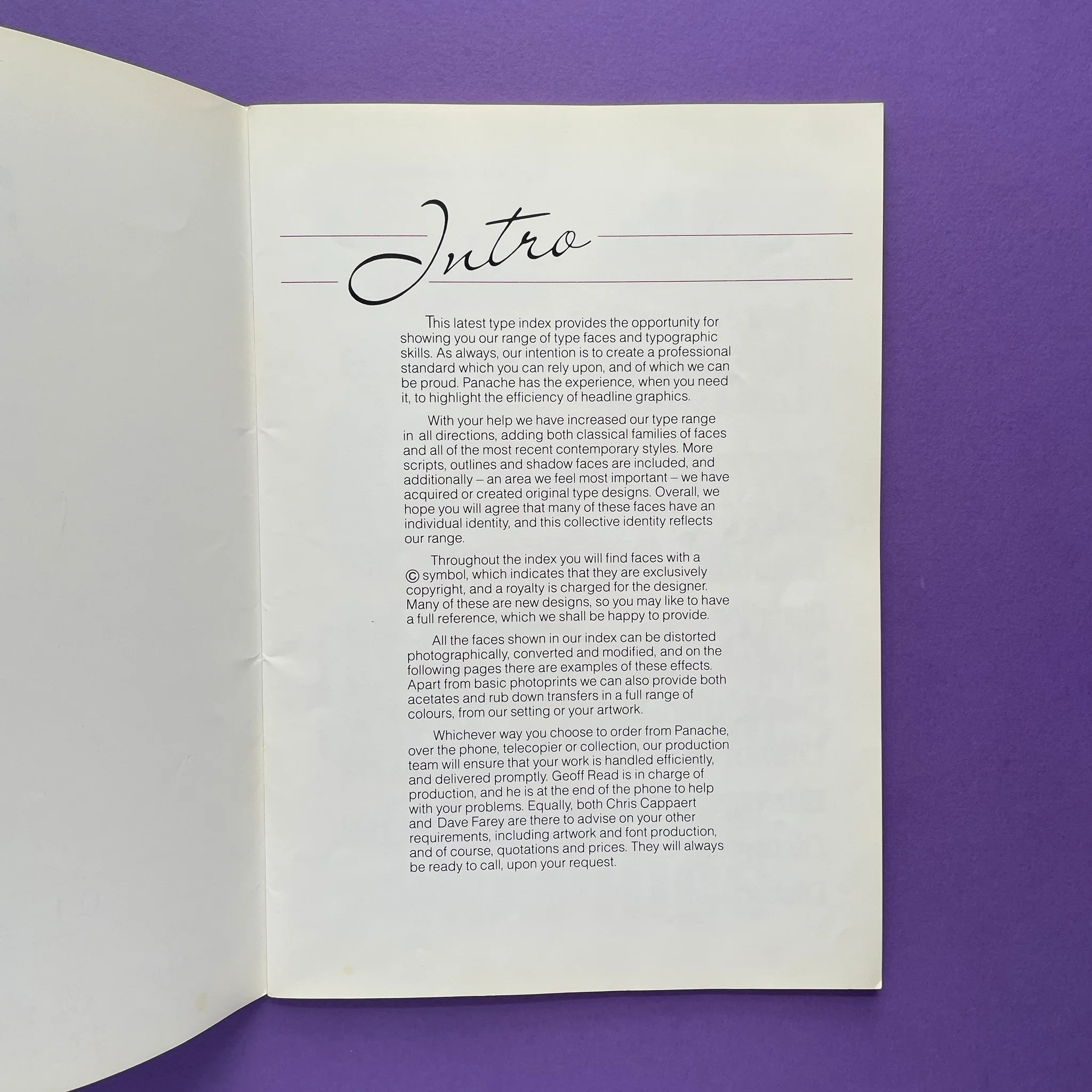 Type Finder | Panache | ca. | 1983 | Panache | Photo | UK | London | Name | Booklet | 05/27/2025 | $27.32 | FIU (Berlin) | London: Panache Graphics Limited, n.d. A4 booklet with silver cover and name samples for 1,760 headline styles. Issued after 1981 (ITC Barcelona is included) and before 1990 (much fewer typefaces than in the 1990 Headline Index). | Jul 19, 2025 10:56 PM | |||